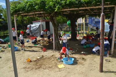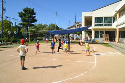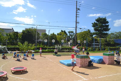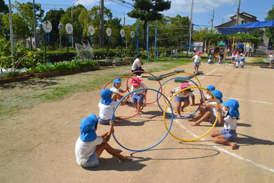 地域の小さいお友達と一緒に、ミニ運動会をしました。ばら組さんがアスレチックの見本を見せてくれて、小さいお友達の時は、フープのトンネルをしてくれました。