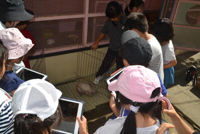 1年生の国語の授業の生き物との触れ合いに活用するため、1年生はうさぎやカメをタブレットで撮ったりよく観察したりしていました。