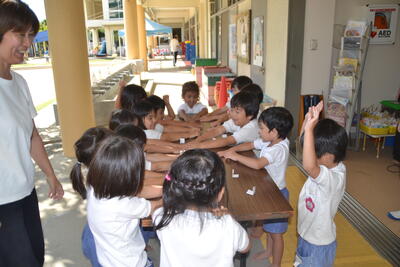 運動会当日に、お家の人が座る座席のくじ引きをしました。まずはなでしこ組さん。
