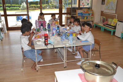 なでしこ組さんが間引いた大根をお味噌汁にして、お弁当の時に食べました。何度もおかわりする人もいましたね。