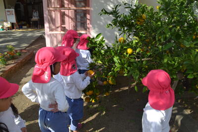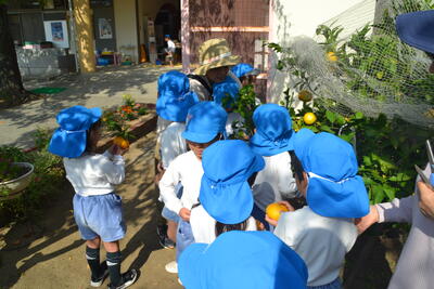 みかんも色づいてきたことに気づいたなでしこ組さん。今日はハサミで切って収穫しました。