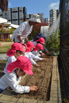 阪神淡路大震災で亡くなったみりちゃんが育てていたえんどう豆の種を、なでしこ組さんがばら組の時から大事に育て、5月にたくさん収穫しました。その種をなでしこ組さんが、ばら組さんに育ててくれるようお願いしました。