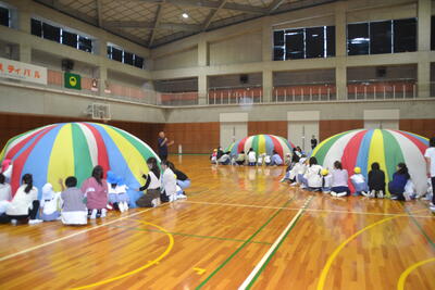 みんなでしたパラバルーン。お家の人も一緒に楽しみました。