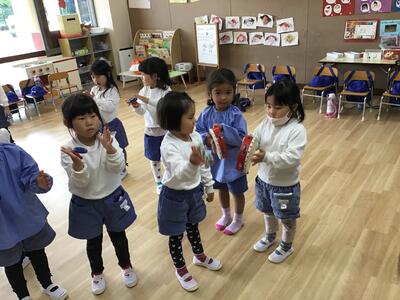幼稚園でお留守番をしてくれていたばら組さんは、楽器で遊びました。