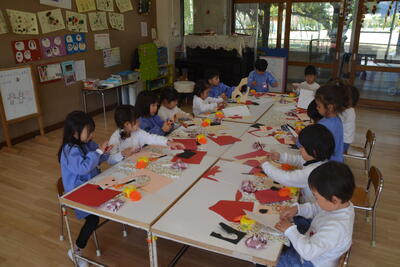 来週はサンタさんが潮見幼稚園に来てくれるかもしれません。ばら組さんはサンタクロースを作りました。