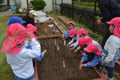野菜の先生に来ていただき、ばら組さんが玉ねぎの苗を植えました。大きい組になったら収穫するのが楽しみですね。
