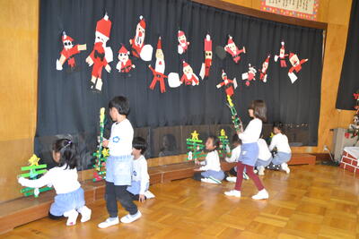 そして、ホールを夜の世界にして、なでしこ組さんが作ったクリスマスツリーを飾りました。