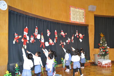 明日は、サンタさんからのお手紙に書いてあったサンタさんが潮見幼稚園に来てくれる日です。なでしこ組さんは、サンタさんに座ってもらう椅子を用意してくれました。