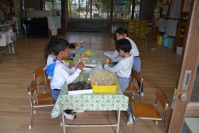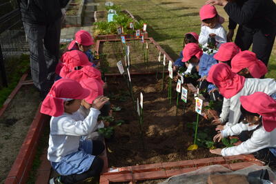 ばら組さんは、野菜の先生に来ていただき、いちごの苗を植えました。なでしこ組になったら、真っ赤ないちごができそうですね。