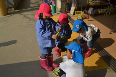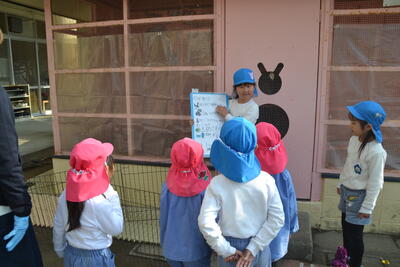 なでしこ組さんが1年生になったら、うさぎのお世話をしてくれるのはばら組さんです。うきうきペアのお兄さんお姉さんがやさしくやり方を教えてくれました。