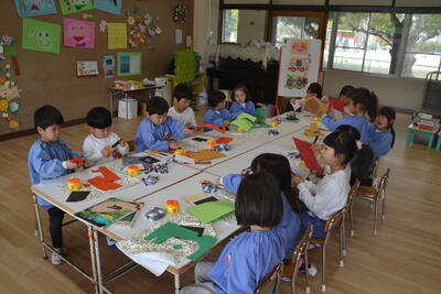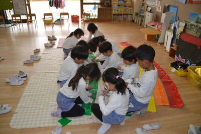 なでしこ組さんはみんなで力を合わせて、虹を作りました。