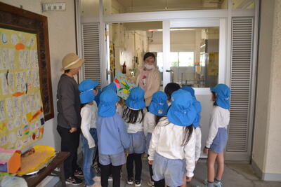 なでしこ組さんは、潮見小学校の給食の先生に感謝の気持ちを伝えました。いつもうさぎのお野菜、ありがとうございます。次からはばら組さんが来ます。