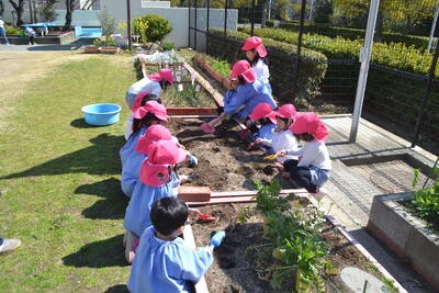 ばら組さんは、来年度にカレーを作るためにじゃがいもを植えます。みんなで畑を耕しました。ふかふかになりましたね。
