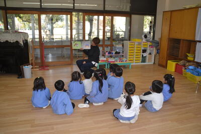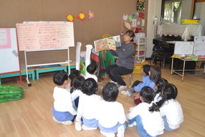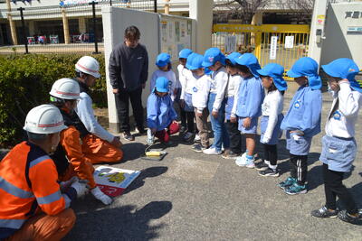 幼稚園の門の前のはばタンシートを新しく貼り替えていただきました。なでしこ組さんがお手伝いをしてくれました。今度入園する新しいばら組さんも、跳び出さずに安全に通えそうです。大きな車で大勢で来てくださり、安全に作業していただきありがとうございました。
