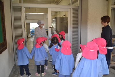 ばら組さんは、潮見小学校の給食室にうさぎの野菜をもらいに行きました。来年度もよろしくお願いします。