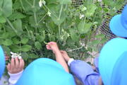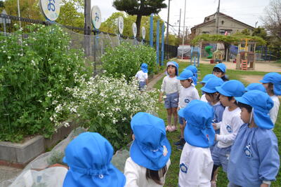 なでしこ組さんは、大根のお花が咲いて種ができていることや、えんどう豆に小さなお豆ができていることを見つけました。
