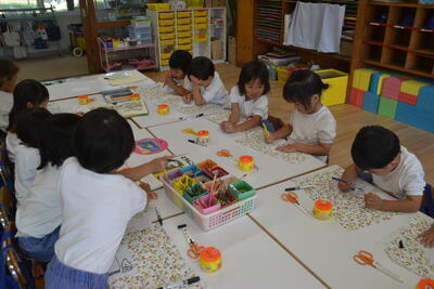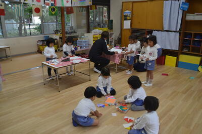 運動会のオープニングで使ったなでしこ組さんが作ってくれた花火の素をお家で作ってきたばら組さんがいました。お友達に作り方を教えてあげました。
