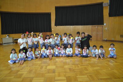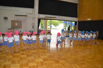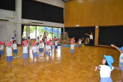 朝は雨が降っていたので、ホールでオープニングと体操をしました。みんな元気いっぱいでした。