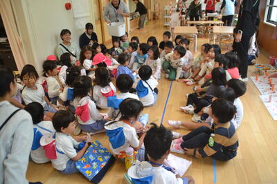 運動会当日に、お家の人が座る座席のくじ引きをしました。まずはなでしこ組さん。