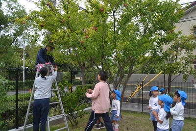 なでしこ組さんがザクロが美味しそうに割れているのを見つけました。収穫してみんなで食べることにしました。