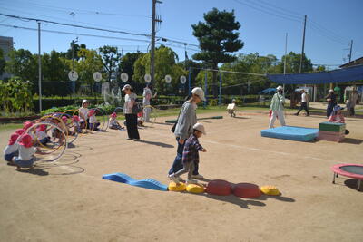 地域の小さいお友達と一緒に、ミニ運動会をしました。ばら組さんがアスレチックの見本を見せてくれて、小さいお友達の時は、フープのトンネルをしてくれました。