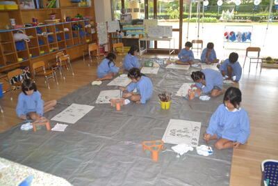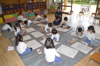 なでしこ組さんは、おととい描いた運動会の絵に、えのぐで色を塗りました。