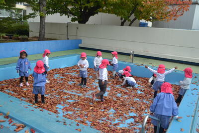 幼稚園のお庭には、きれいな葉っぱがたくさん落ちています。ばら組さんは、葉っぱのプールで遊びました。
