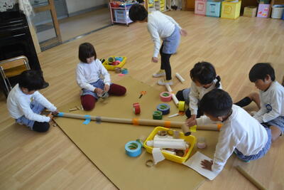 なでしこ組さんは、ドングリを転がす遊びをみんな工夫しながら作っています。