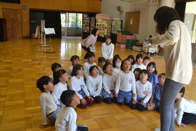 大型絵本をみんなで見ました。大根と人参とごぼうのお話でした。幼稚園の大根も大きくなっていますね!
