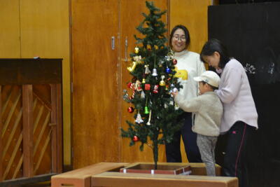 サンタさんをお迎えできるよう、みんなでクリスマスツリーの飾りつけをしました。小さいお友達にも手伝ってもらいました。