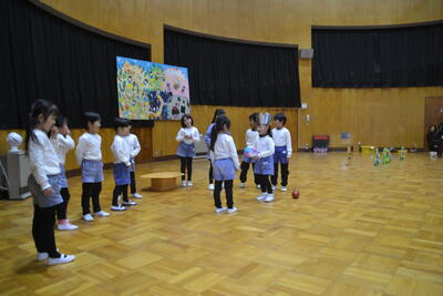 ばら組さんはコマを、なでしこ組さんはけん玉を見てもらいました。諦めずに粘り強く取り組む力が育ち、成長を感じました。