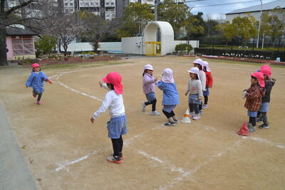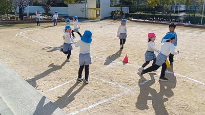 雪が解けると、大好きなリレーをなでしこ組さんとばら組さんが一緒に楽しんでいました。