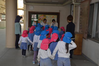 なでしこ組さんは、4月になったら1年生。今日は浜風小学校の1年生と5年生から招待を受け、小学校まで仲よく歩いて行きました。