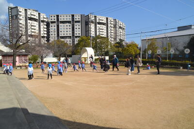 校庭でも遊ばせてもらいました。小学校に行くのがとても楽しみになりましたね。1年生、5年生、ありがとうございました。