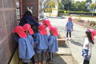 今日もなでしこ組さんがばら組さんにやさしくうさぎ当番のやり方を教えてくれました。