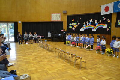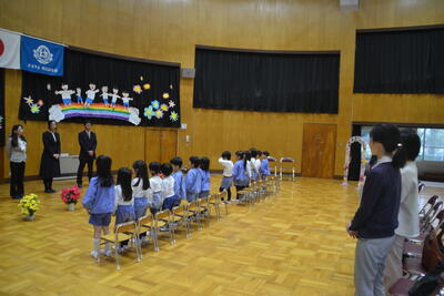 新しく来てくださった3人の先生も一緒に始業式をしました。新しいお友達も増えて、うれしいですね!