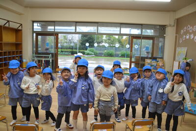 なでしこ組の青いバッチをつけ、なでしこ組の青い帽子をかぶりました。大きい組さんらしくてみんなかっこいいですね!