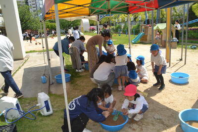 幼稚園の子たちに優しくかかわってくれるお兄さん、お姉さんがたくさんいました。
